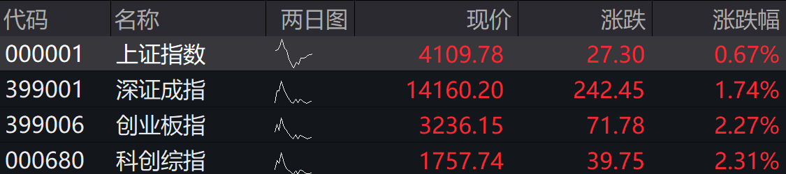 沪指高开0.67%,深证成指高开1.74%,创业板指高开2.27%,科创综指高开2.31%。