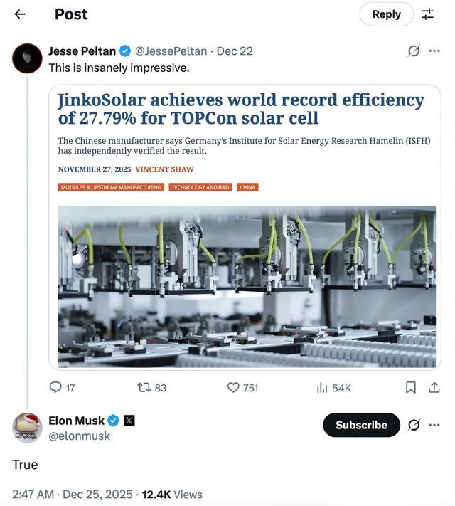 值得堤防的是,2025年年底,好意思国企业家埃隆·马斯克还曾公开点赞过这款光伏电板。