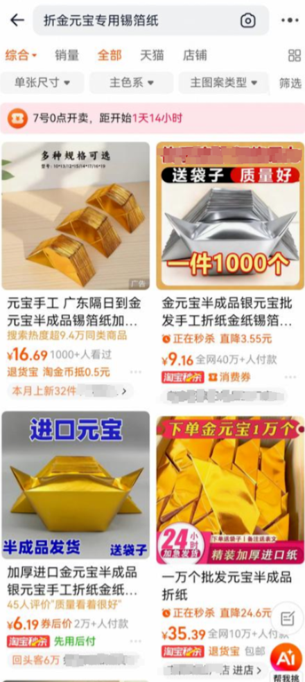 与之酿成赫然对比的是,手工半制品纸元宝不测走俏,成为本年晴明祭祀商场的热门品类,线上销量大幅增长,线下门店以致一度出现断货情况。