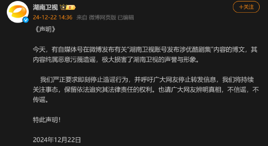 新浪科技讯 12月22日下昼音尘,网传湖南卫视官号发帖称,“优酷超等爆款三连扑。”对此,本日下昼,湖南卫视官方发布声明暗示,今天,有自媒体号在微博发布关系“湖南卫视账号发布涉优酷剧集”试验的博文,其试验老练坏心误解褒贬,极大毁伤了湖南卫视的声誉与形象。