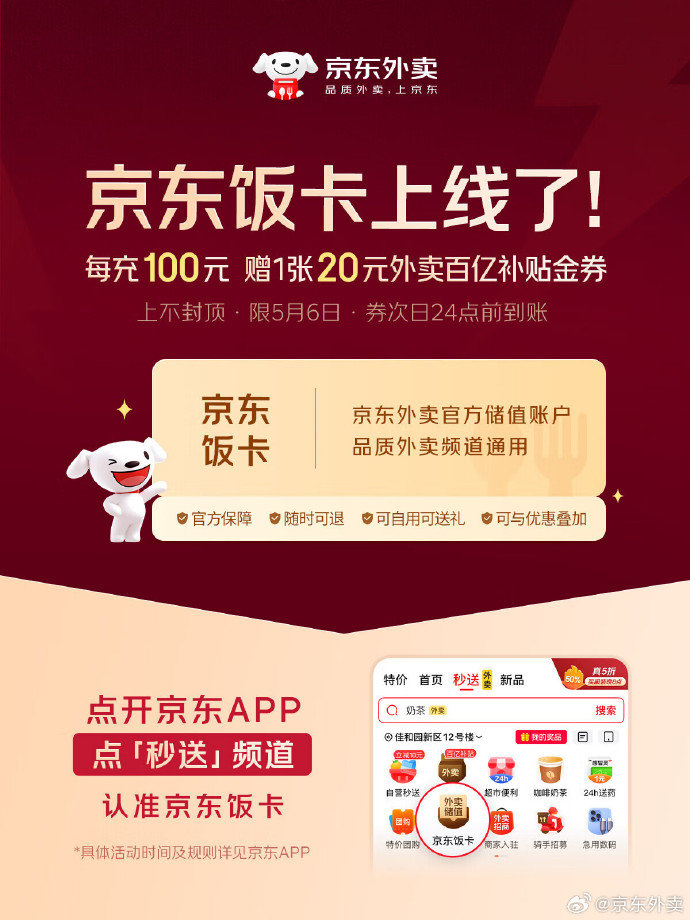 据先容,京东饭卡为京东外卖官方储值账户,在「品性外卖」频谈通用,用户可享受官方保险、随时可退、可耸立、可与优惠类似。