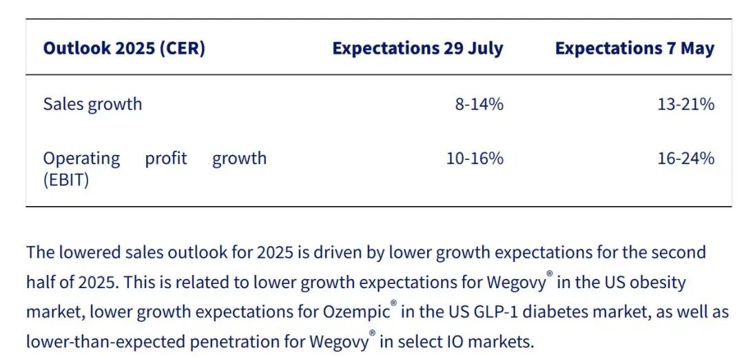 诺和诺德在财报中说起对2025年全年功绩预测,当今其权衡本年销售同比增速在8%-14%之间,规划利润同比增速在10%-16%之间。这两项财务数据预期增速低于此前预期,且低于2024年二者26%的同比增速。