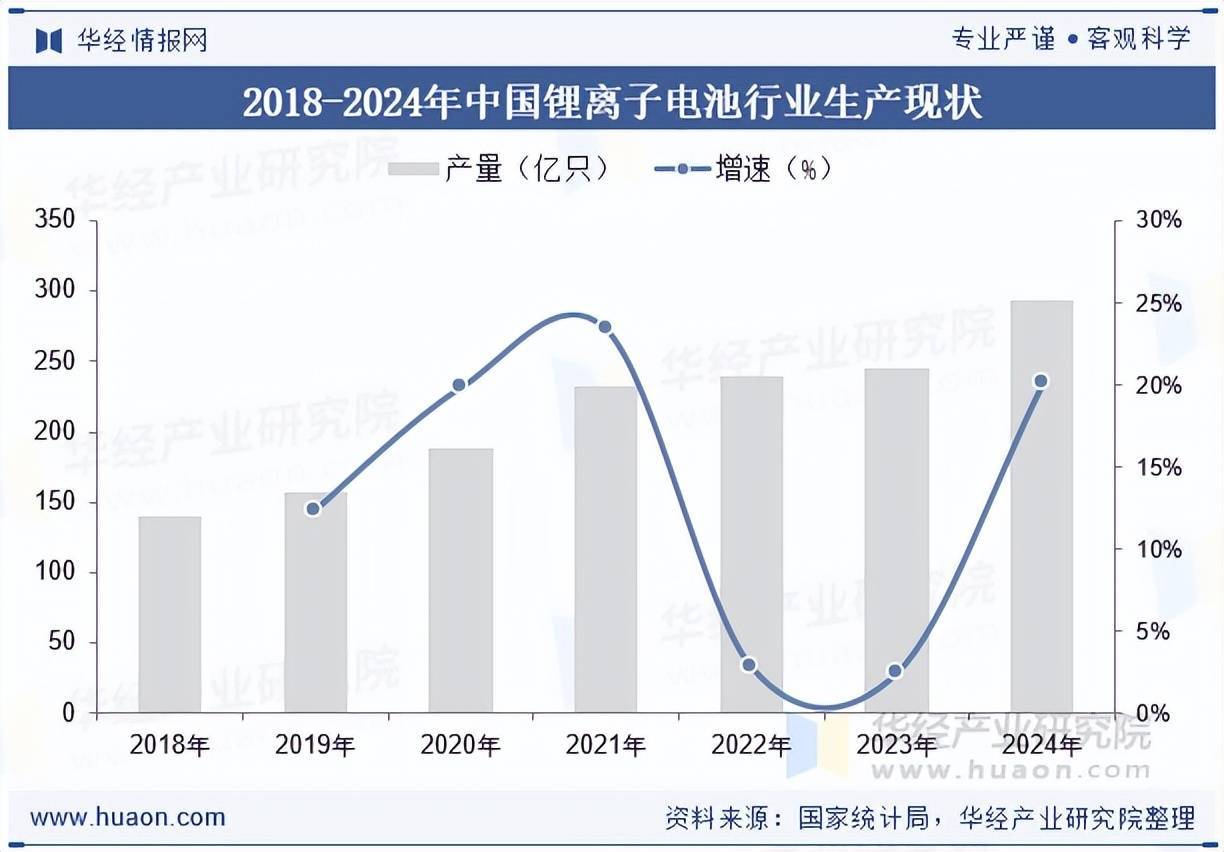 2024年我国锂离子电板产量延续增长态势,左证国度统计局数据显现,2024年我国锂离子电板产量为294.57亿只,同比增长20.1%,2018-2024年复合增长率为13.2%。