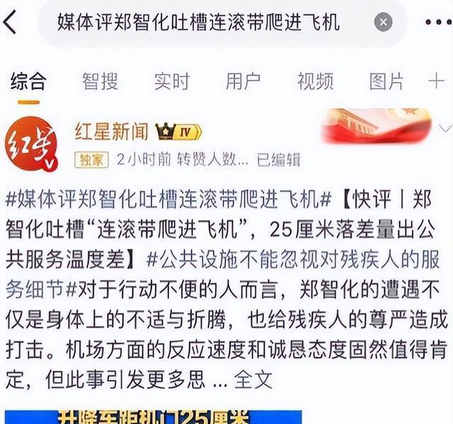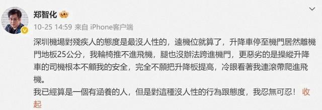 10月25日,郑智化的一条微博引爆了公论,他用“莫得东说念主性”、“分化认识”这样极具冲击力的词描写了我方在深圳机场登机的资格,在他笔下,我方透彻莫得赢得一个假想的“护理”,我方轮椅与升降平台之间20厘米的高度差,让我方的尊荣被踩的毒害。